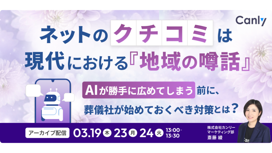【アーカイブ配信】ネットのクチコミは、現代における『地域の噂話』。 AIが勝手に広めてしまう前に、 葬儀社が始めておくべき対策とは?