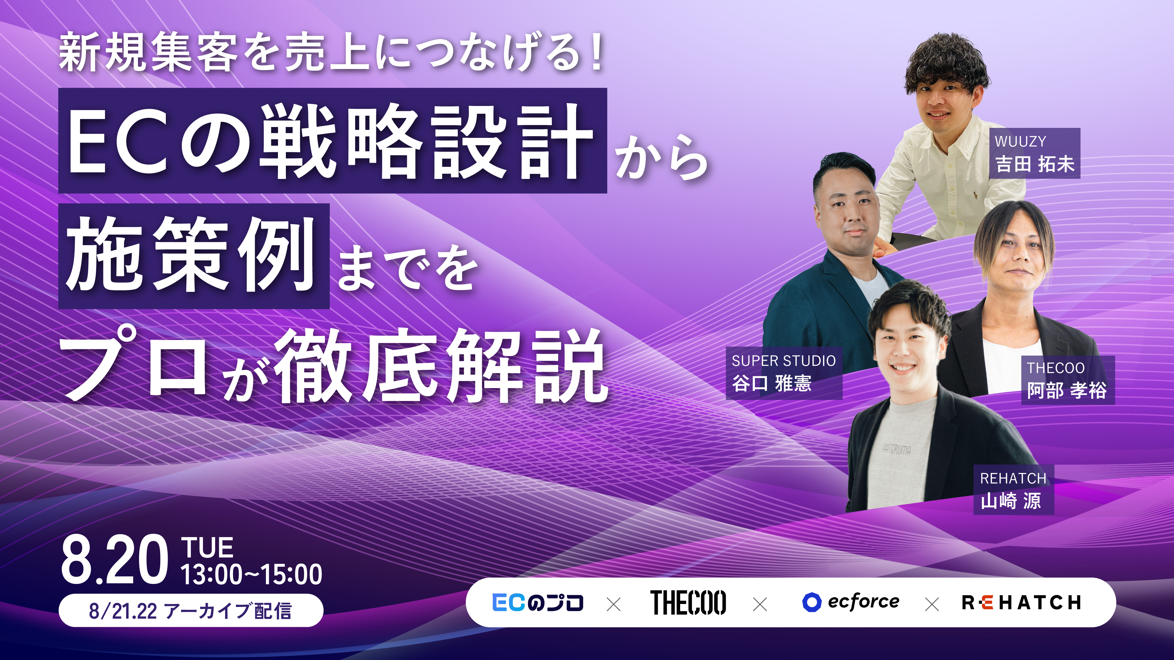ご入力いただいた個人情報は、REHATCH株式会社が取得し、本セミナーの共催企業である株式会社SUPER STUDIO、THECOO株式会社、株式会社 WUUZYに提供いたします。 当該個人情報について、REHATCH株式会社及び株式会社SUPER STUDIO、THECOO株式会社、株式会社 WUUZYは、本人の同意がある場合を除き、下記目的に使用すること以外には一切使用せず、また本人を特定できるような情報を第三者に提供することは一切ありません。