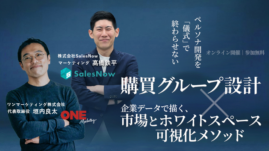 さらに後半では、SalesNow社による企業データの活用術を交え、設計した購買グループをもとに自社の市場全体を俯瞰し、まだ手が届いていないホワイトスペースを可視化する方法をご紹介します。