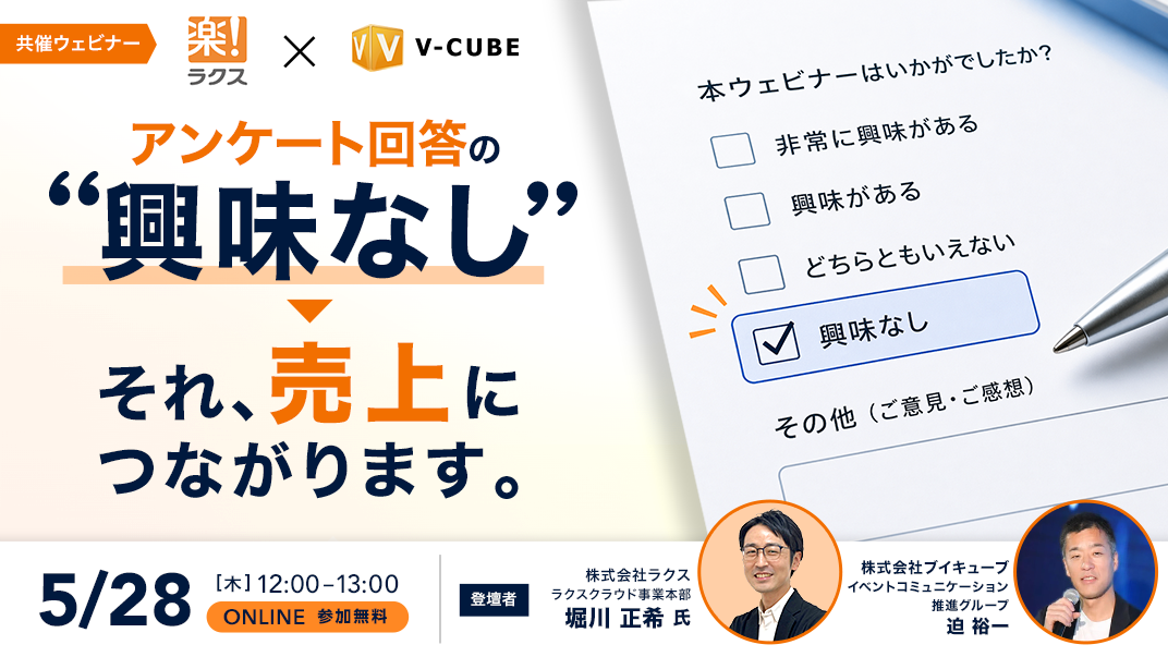 ※セミナーの内容に関する補足資料の送付や、アフターフォローのため、株式会社ブイキューブおよび株式会社ラクスよりご連絡を差し上げる場合がございます。