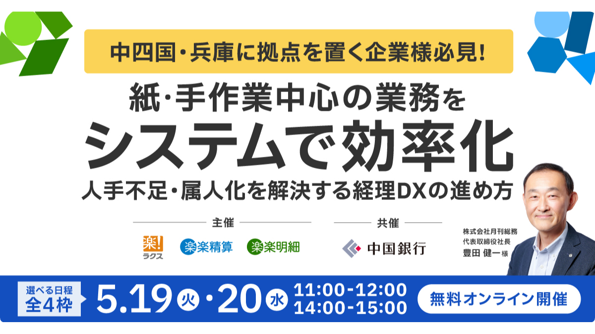 ・株式会社ラクスは、ご入力頂いた個人情報を商談の結果の共有及び、本セミナーの運営管理および各種サービスのご提供・ご案内(広告メールの配信を含む)のため、共催企業である中国銀行に提供いたします。
