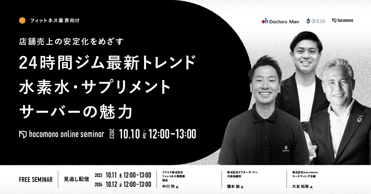 本セミナーでは水素水サーバーを提供するドクターズ・マン社とサプリメントサーバーを提供するドリコス社をお招きして、双方の特徴と導入による店舗経営におけるメリットをお話しいただきます。