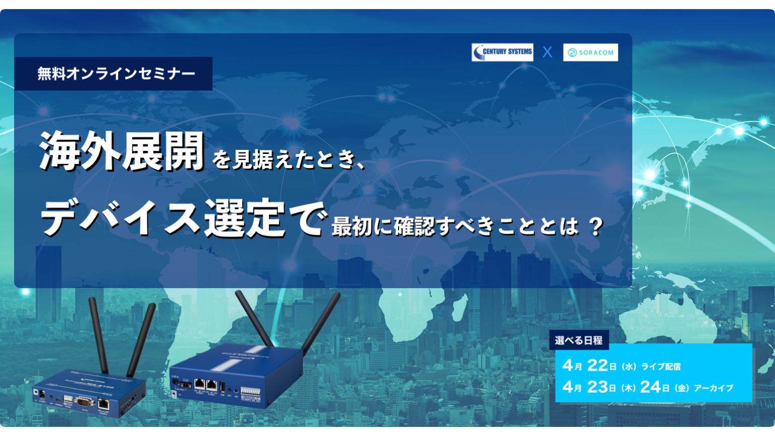 本ウェビナーでは、IoTプラットフォームを国内外で展開しているソラコムと、SPS認定済デバイスパートナーとして、グローバル認証済みゲートウェイで豊富な実績を持つ、センチュリー・システムズが登壇。 欧米から成長著しいアジア圏までを視野に入れ、デバイス選定の落とし穴から、最新の認証事情、そして「SORACOM Boot」を活用した効率的な海外キッティング手法まで、グローバル展開を成功させるための「実務の要諦」を凝縮してお届けします!