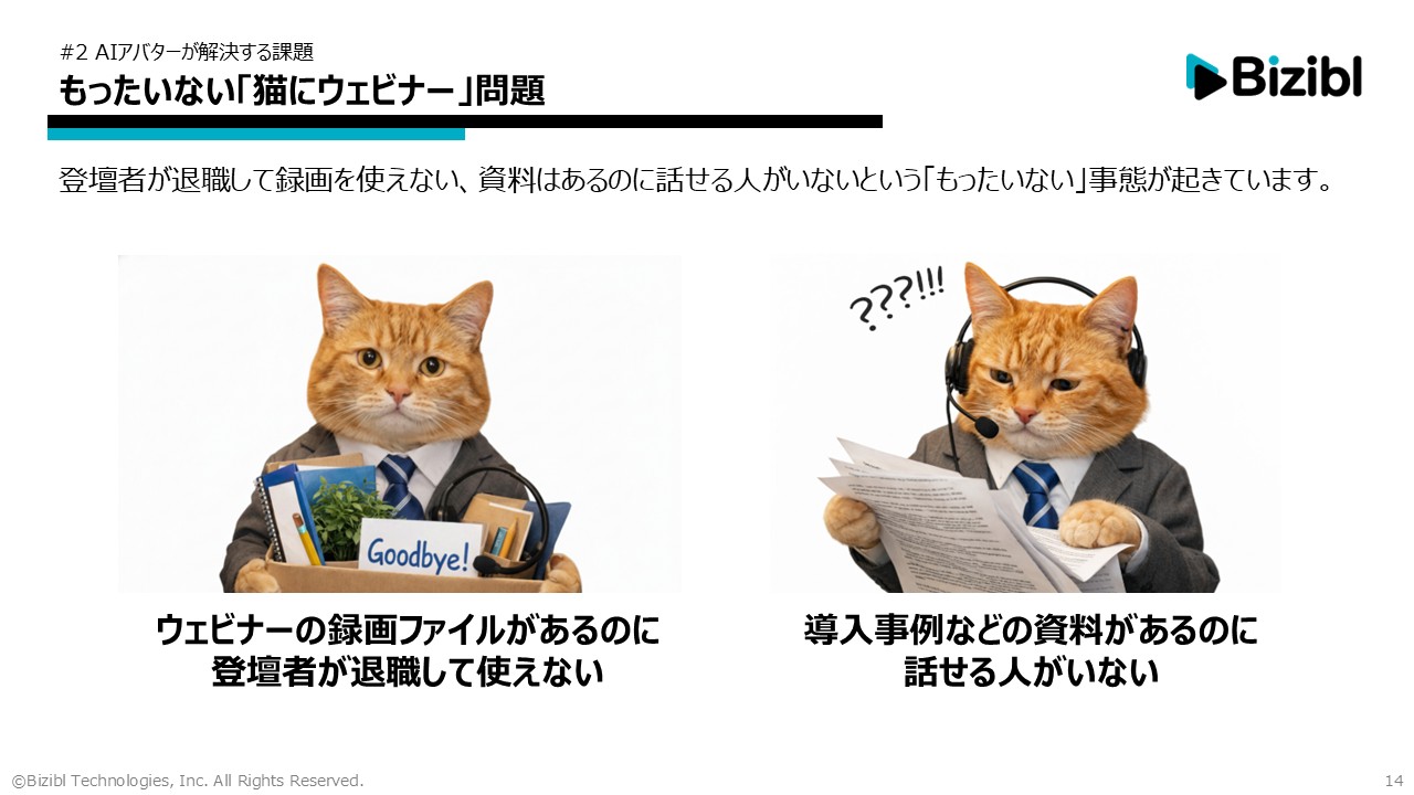 今回の「ウェビニャー」では、弊社のAIアバターが自ら登壇。 貴社のフォルダの奥で眠っているホワイトペーパーや、一度やったきりの過去動画や、ウェビナー録画はあるけれど登壇者が退職して使えない動画を、「商談を生む資産」へと生まれ変わらせる方法を公開します。
