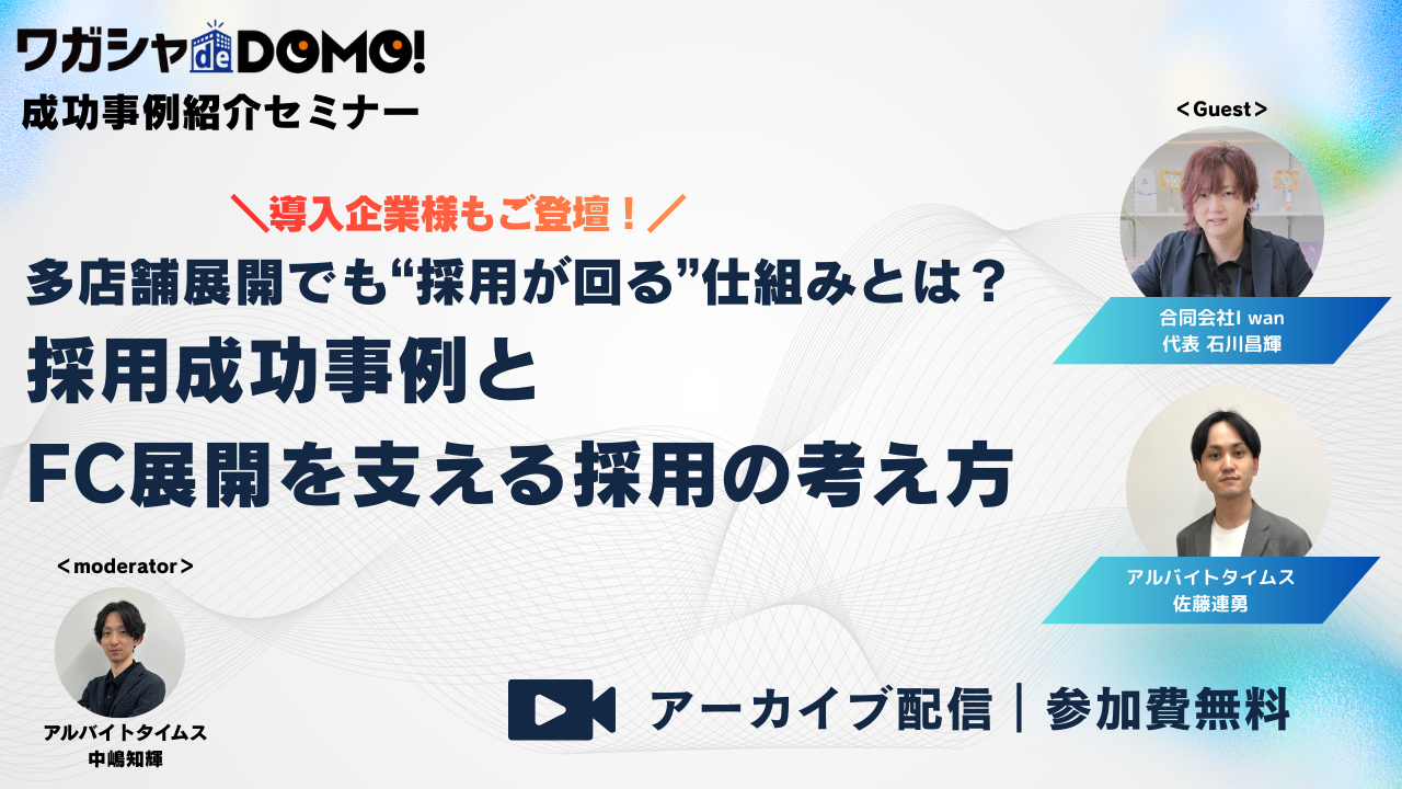 本セミナーでは、実際に採用支援サービスを活用し、採用成功を実現した企業のリアルな取り組みをご紹介します。ゲストに合同会社I Wan 代表 石川昌輝様をお招きし、サービス導入にあたってどのような課題を抱え、どの施策を選び、どんな工夫によって成果につなげたのか、現場目線でお話しいただきます。