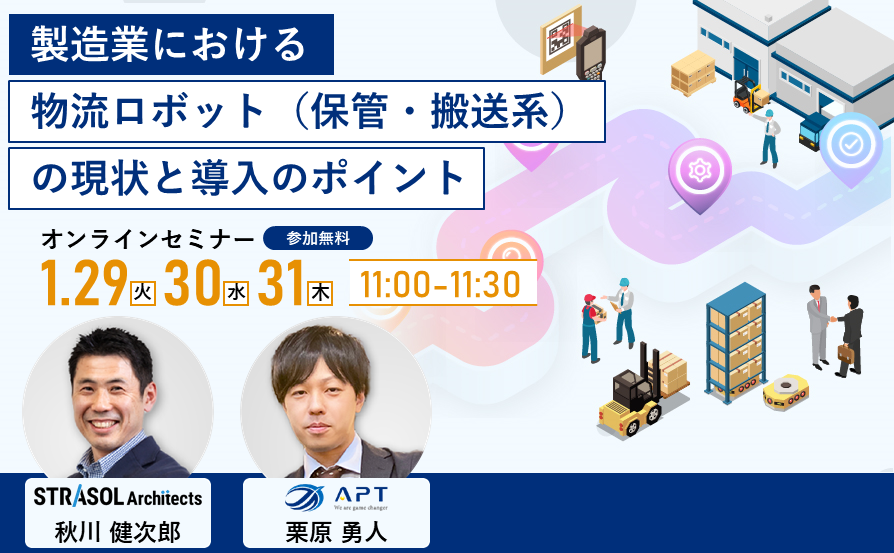 物流ロボットのインテグレーションを進める株式会社APTと、数々の物流センターデザインを手がける株式会社ストラソルアーキテクトが、製造業における物流ロボットの現状に焦点を当て、AGV・AMR等の特長や用途、導入事例を交えつつ物流ロボット導入におけるポイントについて解説します。