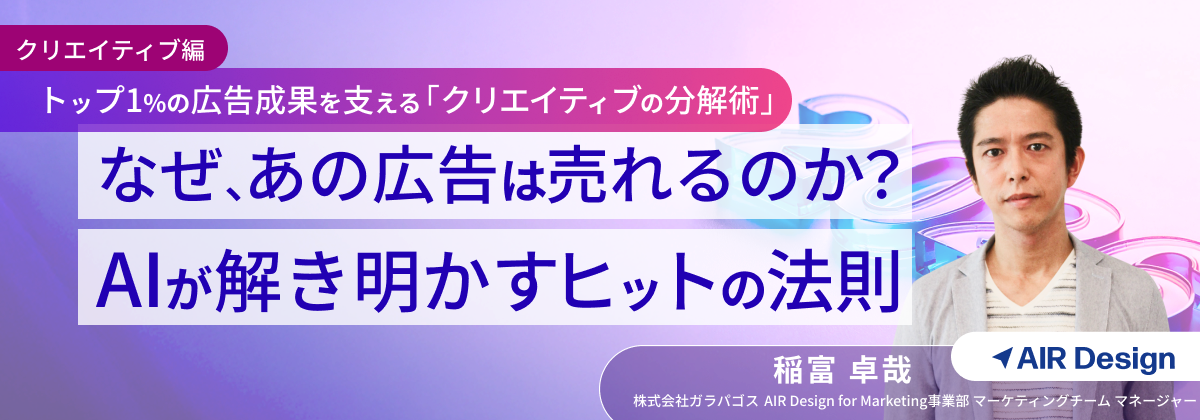 本セッションでは、そのブラックボックスを解明する「クリエイティブの分解術」を公開。AIを活用して競合の"勝ちパターン"を徹底的に分析し、成果の裏側にある「ヒットの法則」を導き出す、AIR Designが実践するデータドリブンなクリエイティブ設計の全貌をお話します。