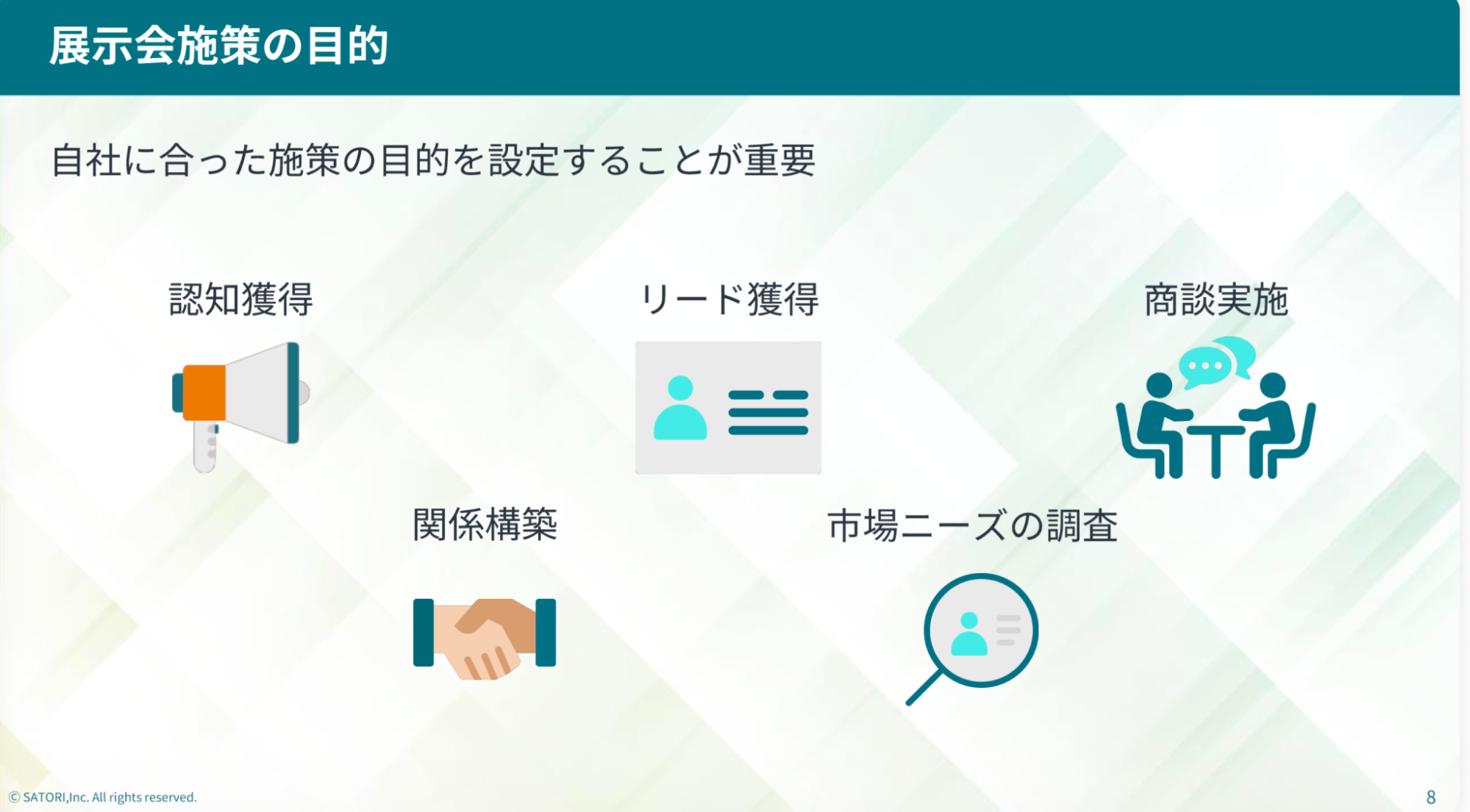 SATORIはもともと、商談の目的を「2.リード獲得」に設定していました。今期からは40万件以上のリードデータを保有するようになり、重複率も増えてきたため、「3.商談実施」にシフトしています。こうした目的の変化があれば、KPIやブース設計、当日の行動、フォロー方法のすべてが変わるという点を理解しておくことは重要です。