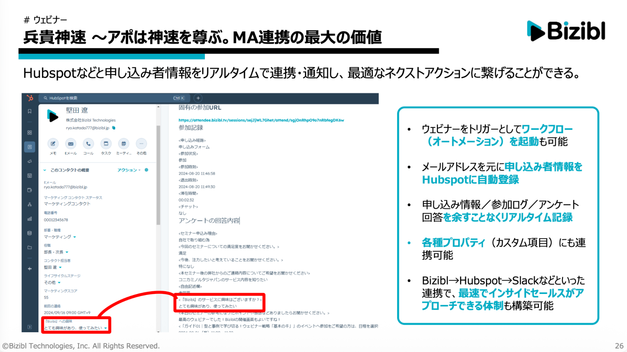 Biziblは、HubSpot、Marketo、SalesforceなどのMA(マーケティングオートメーション)と連携可能です。申込者情報をリアルタイムで連携し、Slackに通知ができます。これにより、架電担当者が優先順位の高い順から即座に電話をかけられるようになるのです。
