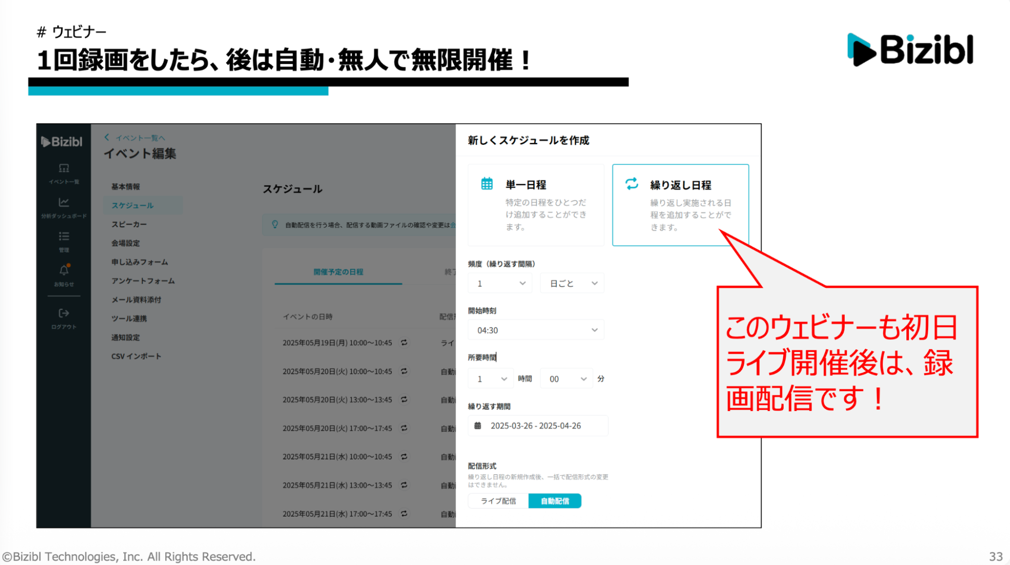 即商談に至らない見込み客を商談化するには時間がかかります。しかし、毎回リアルでウェビナーを開催するのはリソース的に困難です。そこで、ビジブルの録画配信機能を活用します。一度ライブで開催したウェビナーを録画し、日時を指定するだけで、自動かつ無人でずっとウェビナーを開催し続けられます。