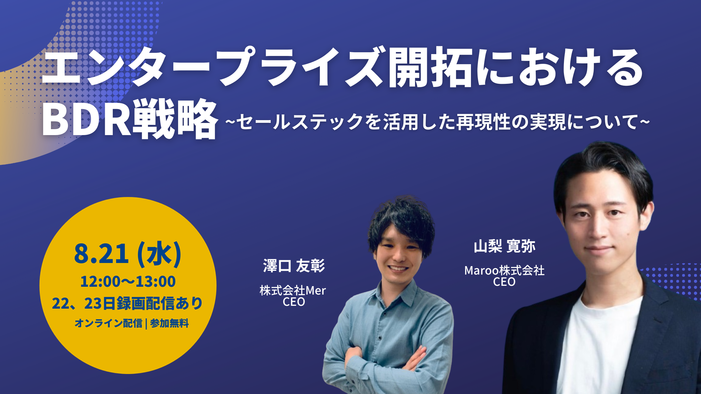 そこで今回は、外資系SaaS企業にて数百社の営業・マーケティング戦略や顧客エンゲージメントのシナリオ構築を支援された実績をお持ちのMaroo株式会社CEOの山梨様をお招きし、エンタープライズ開拓におけるBDR戦略についてお聞きいたします。
