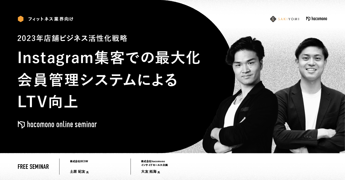 今回はInstagramのプロ集団SAKIYOMI社(累計400万フォロワーの運用実績)と店舗DXツールを提供するhacomono社(2,000店舗以上の導入実績)の2社で店舗ビジネス活性化戦略をお伝えいたします。