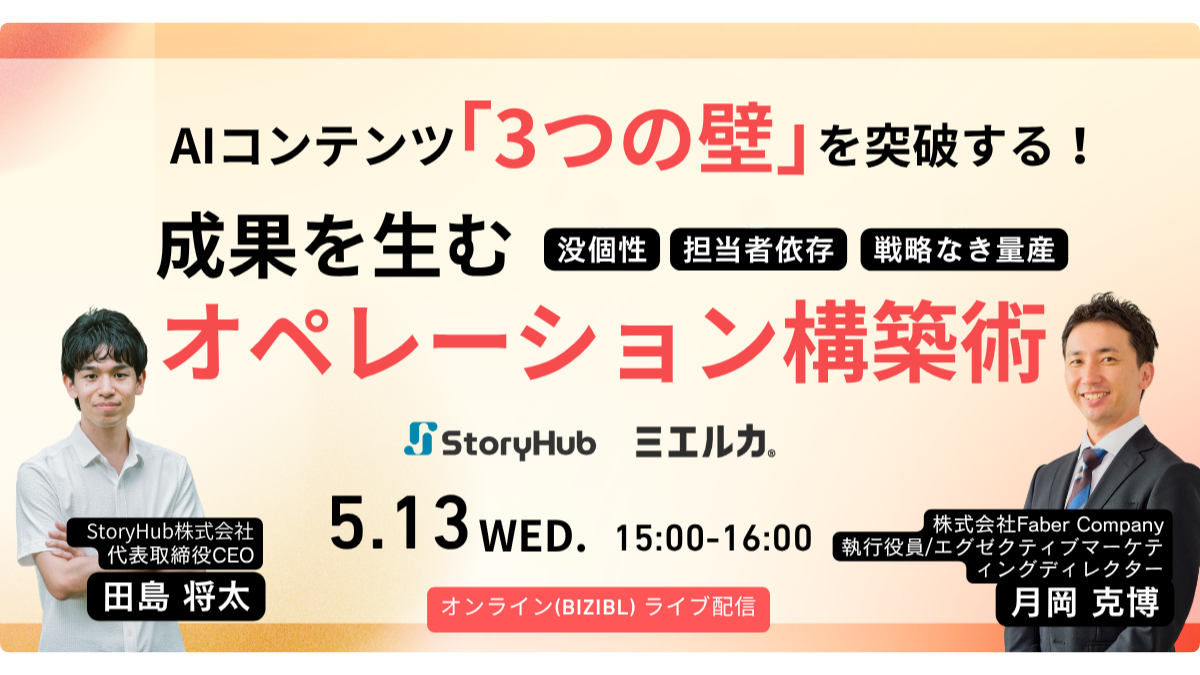 本セミナーは、10年以上にわたりSEOと検索コンテンツの知見を積み上げてきたFaberCompanyと、メディア運営の知見をもとに約200社へAI記事制作ツールを提供するStoryHubが登壇。