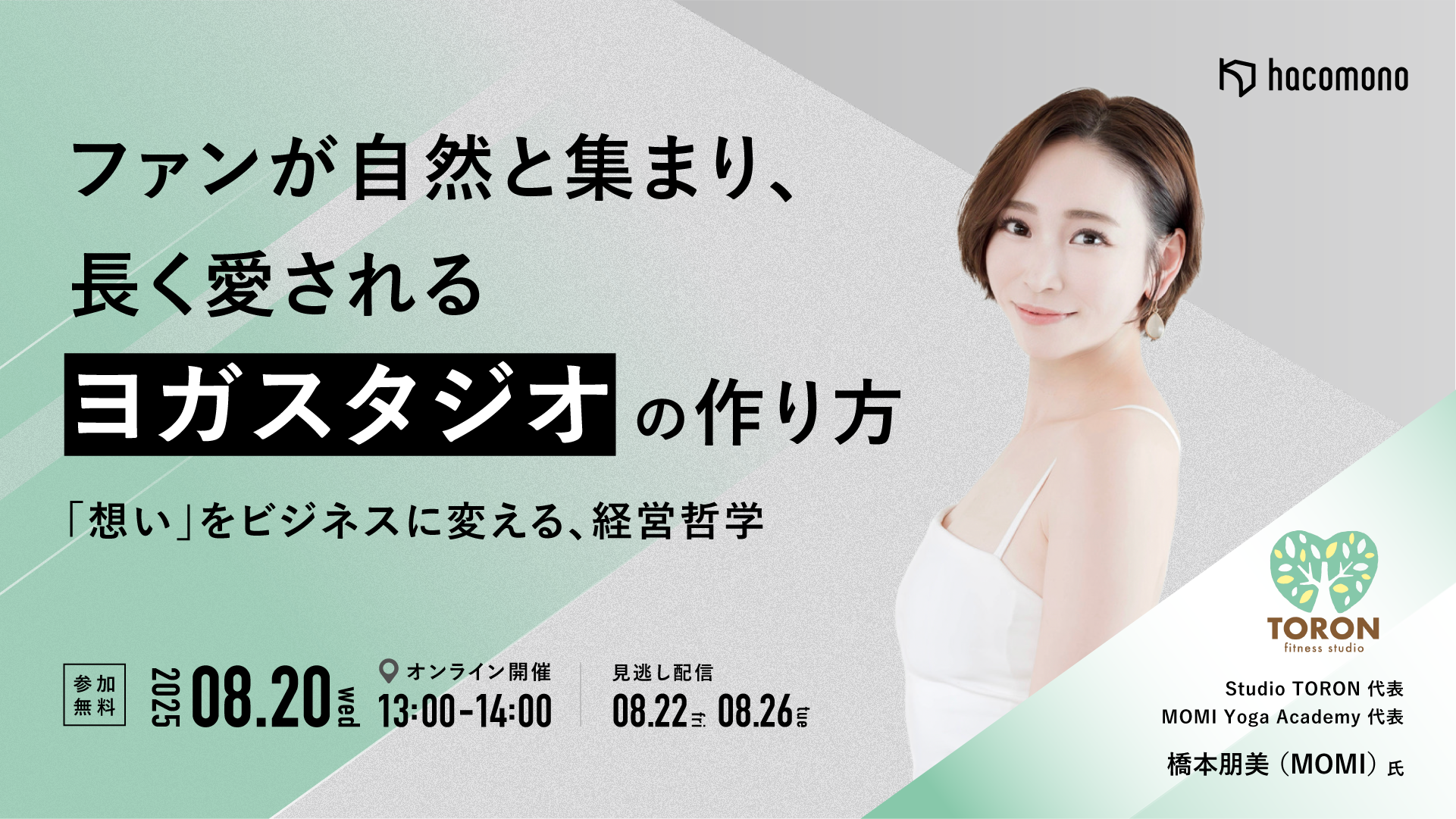 本セミナーでは、Studio TORON代表 / MOMI Yoga Academy代表の橋本朋美様が実践する、生徒がファンとなり集い続けるコミュニティ作りの秘訣と、その「想い」を支える効率的なスタジオ運営の両輪に焦点を当てます。