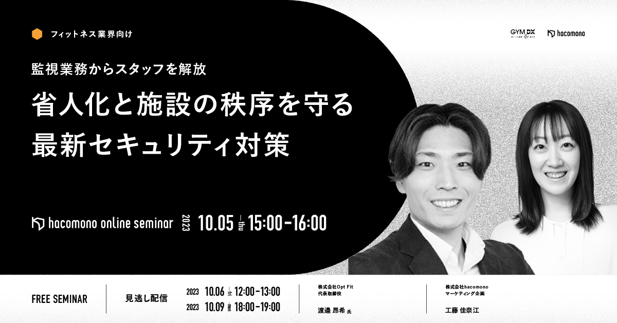 Opt Fit様はジム運営をAIでDX化するサービス「GYM DX」を提供しております。本セミナーでは具体的な導入事例をもとに無人・有人で効率的に安全管理を推進する方法をご紹介いただきます。