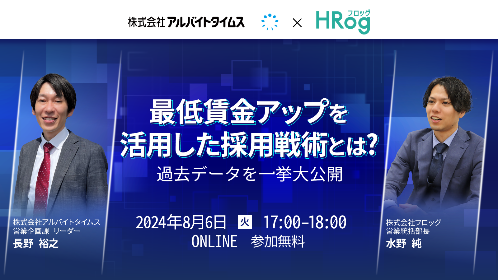 本セミナーでは株式会社フロッグの水野様をゲストにお迎えし、最低賃金改定により実際の時給相場の変化や、正社員、アルバイト・パートの各求人件数推移など、実際のデータを用いて採用市場の今後を解説いたします。