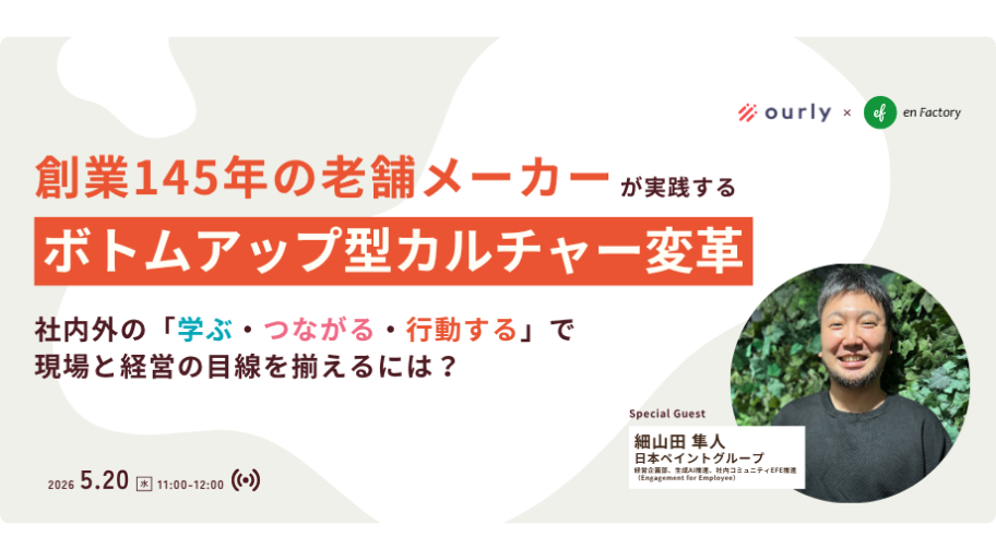 本セミナーでは、細山田氏の実体験をもとに、累計400社以上の越境学習を支援するエンファクトリーと、累計250社以上のエンゲージメント向上を支援するourly(アワリー)を交え、「現場と経営の目線を揃えるための具体的なアプローチ」を深掘りします。