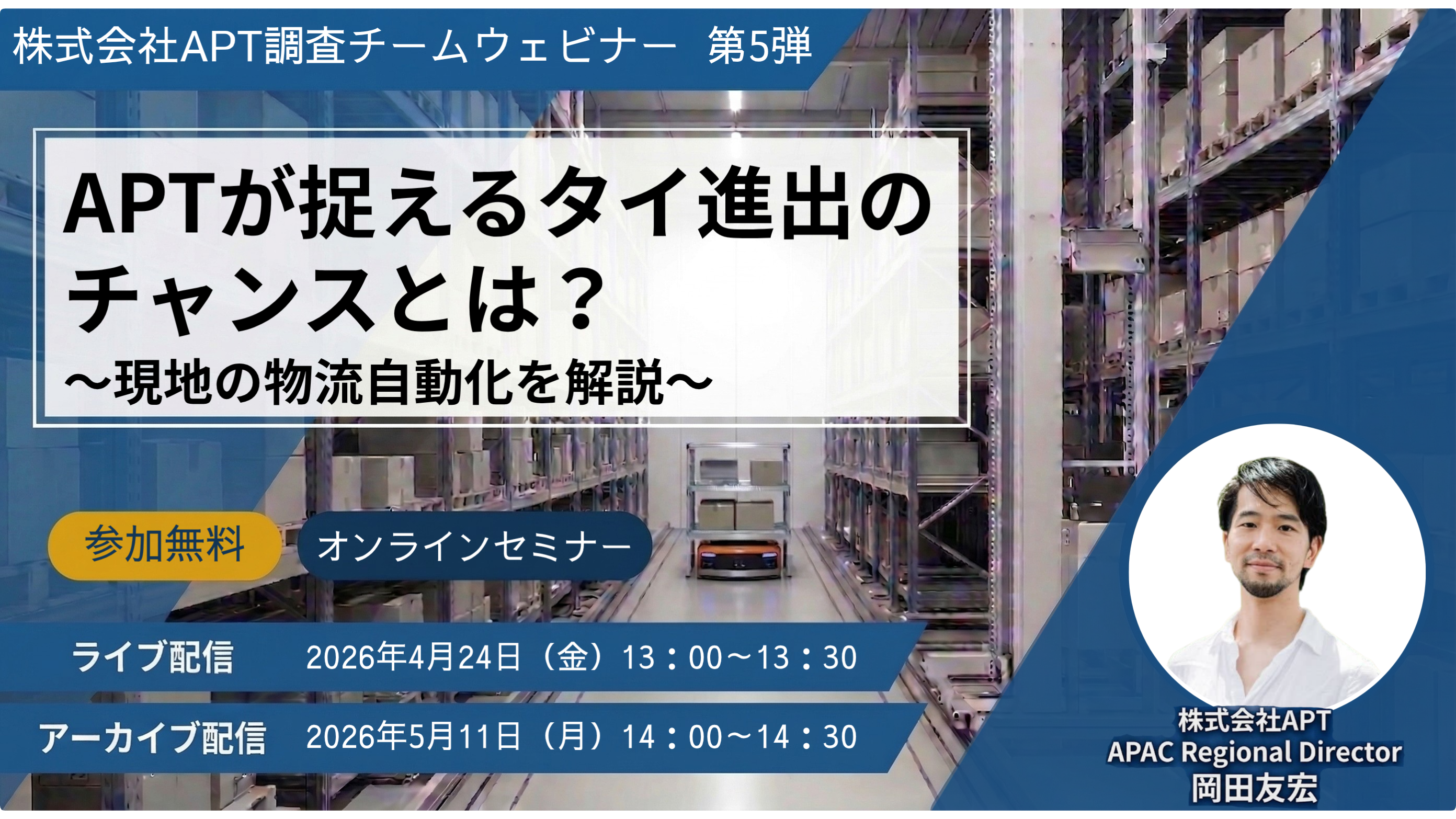 本ウェビナーでは、APTが発表したホワイトペーパー「タイの物流自動化最前線」に基づき、激変するタイの物流・製造現場における生き残り戦略を解説します。