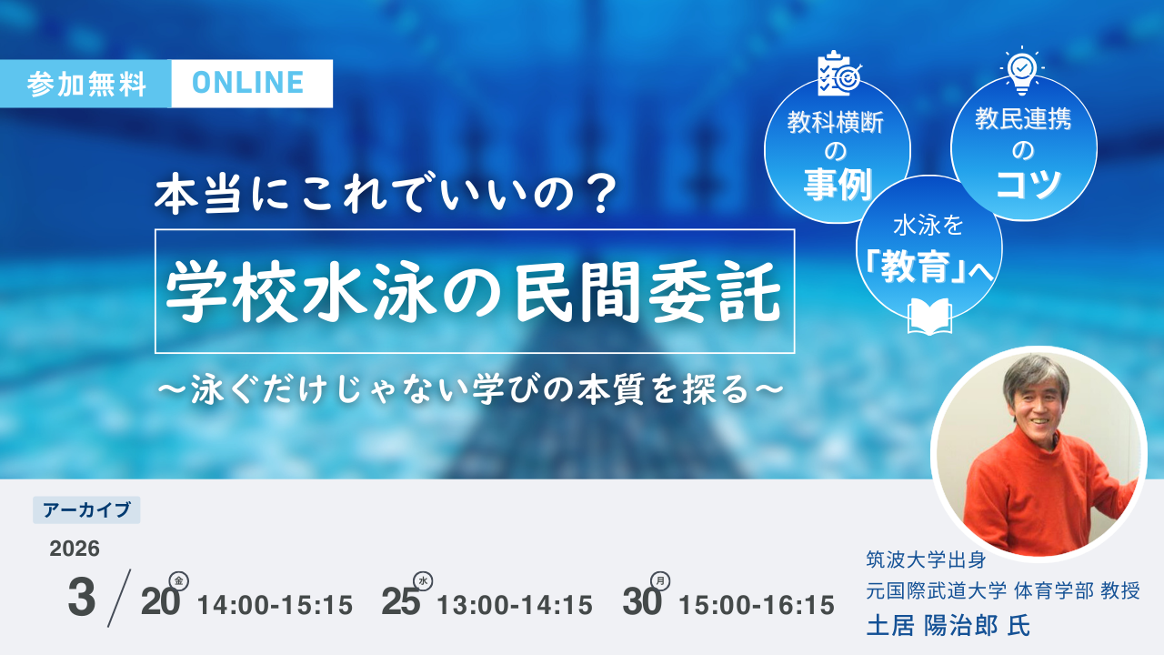 本ウェビナーでは、元国際武道大学教授の「土居 陽治郎 氏」をゲストにお迎えし、水泳を通じた新しい学びに向けた勉強会を開催いたします。