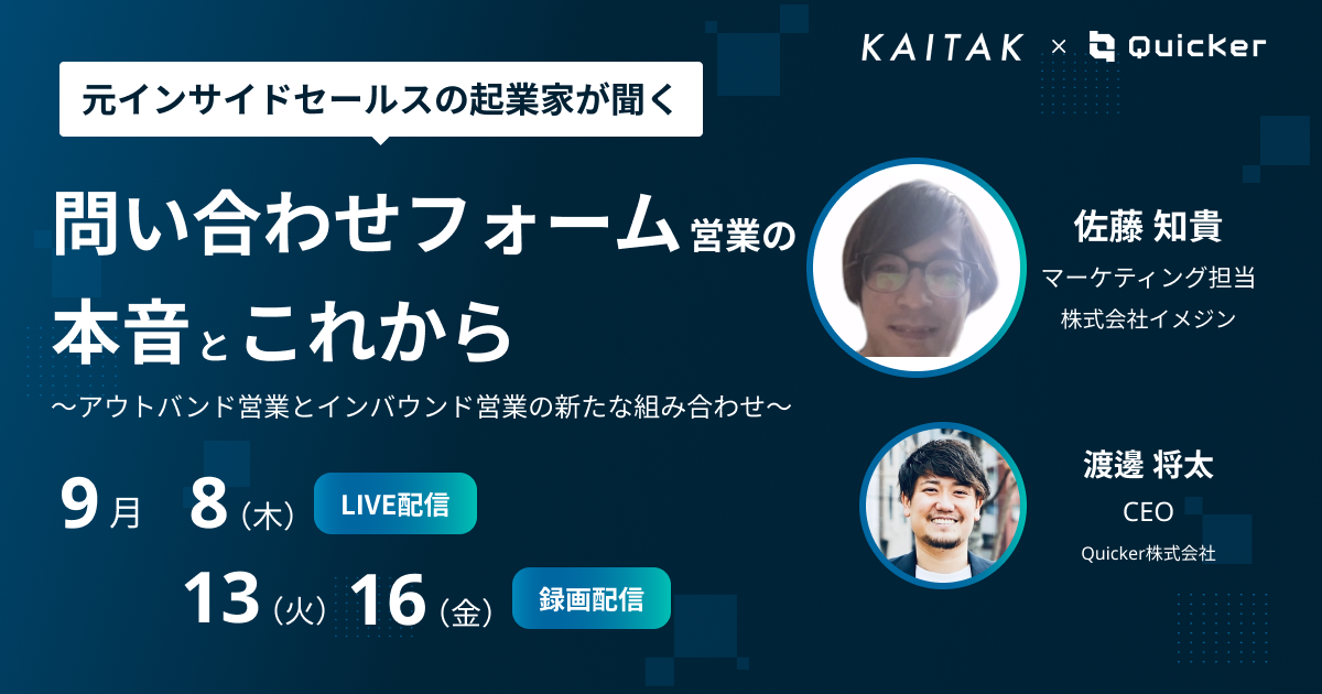 問い合わせフォーム営業を自動化する、「KAITAK」を提供している株式会社イメジン様のマーケティング担当の方をお招きし、元インサイドセールスの起業家Quicker渡邊が切り込みます!